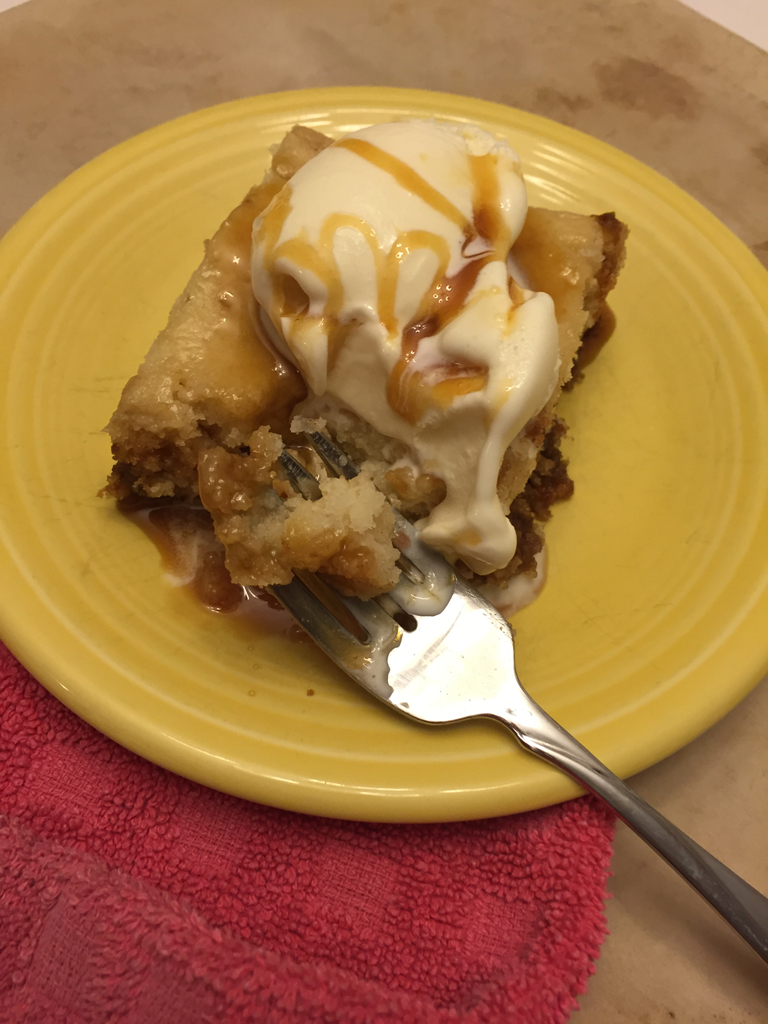 I absolutely love this cake because there’s apples in it, it’s warm, and it’s cake, and best of all, it’s perfect for breakfast, or for any time of day! Another good way to enjoy this cake is top it with a scoop of vanilla ice cream and drizzle it with caramel…yeah, now we’re talking!!