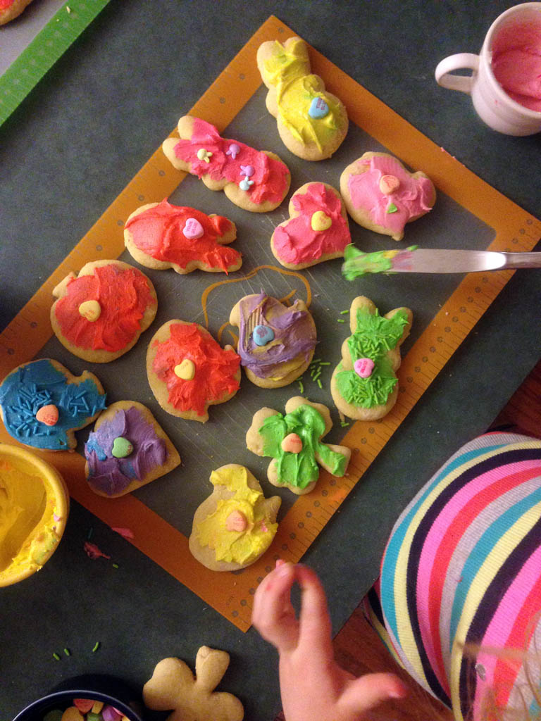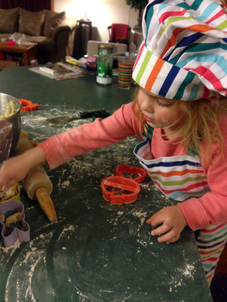 Alex wanted to celebrate most of the major holidays. We made hearts, bunnies, peeps, pumpkins, turkeys, and shamrocks. She was so fascinated by how the dough felt and yes, tasted when it got on her fingers, and I probably washed her hands about 354 times. With guidance, she rolled out the dough and pushed the cookie cutters down into it. So much fun was had by all, and there was enough flour on the floor to create an ice rink!