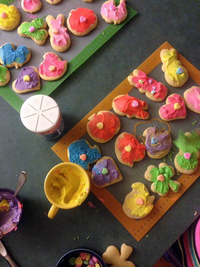 Icing is always the fun part! We used the leftover conversation hearts from Valentine’s Day and some Easter sprinkles as the finishing touches for Alex’s creations. With a tot, you can’t get too technical with decorating, like I usually do, but she enjoyed spreading a little bit of icing on the cookies and topping them with the hearts. We had a springtime palette of icing, and we made the turkeys purple and the pumpkins green. We made enough cookies to share with friends and family, so we put them in gift bags and tied them up with ribbon. Simply adorable!