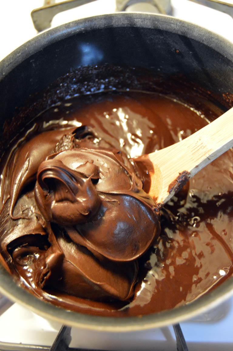 Some people do the glass bowl method over the saucepan to melt chocolate. I just throw it in the saucepan, but of course, being careful not to burn the chocolate or you’re going to have bits of burnt pieces in your fudge and that’s not cool. Throw in your stick of margarine and a bag of chocolate chips and stir away!
