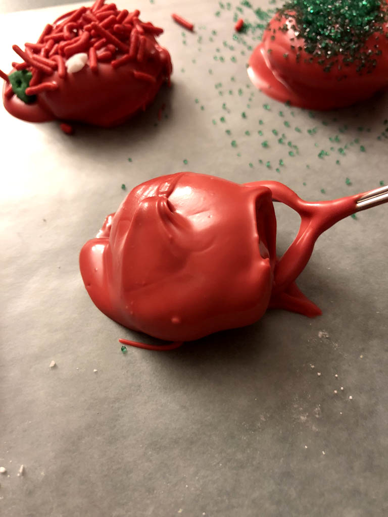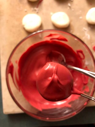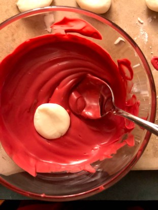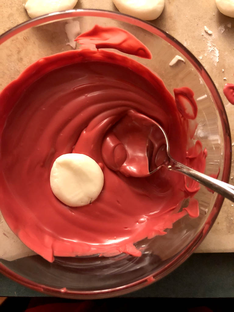 I cut off a section at a time, then cut off small pieces and roll in my hands to create a ball. Then I flatten each ball a little bit and place on wax paper until they’re dipped into the melted chocolate. I place one creme ball into the chocolate and cover it up with a spoon. Then I take my candy scoop and scoop it out of the chocolate and place on wax paper to completely set. Now you don’t want to leave the creme balls in the warm chocolate very long or they’ll begin to get real soft and may melt, so be quick. Once they’re set you can store in a container on your counter top or give them away in cute treat bags.
