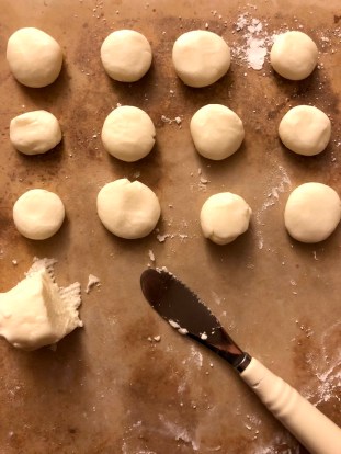 – When ready to make your melts, unwrap the filling and slice a piece of it lengthwise. Cut small pieces one at a time, and roll each piece into a ball with your hands. Flatten the ball of cream in your hands and place on parchment or wax paper. Continue this process with the rest of your filling, or you can make so many patties at a time if you’d like; place leftover filling in the fridge until it’s time to make more again.