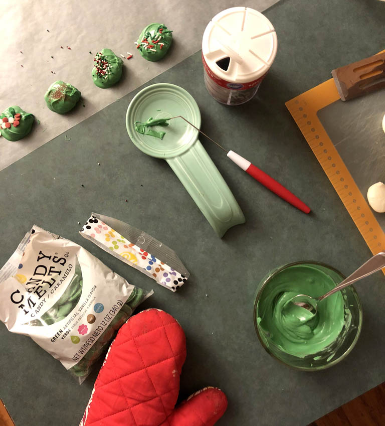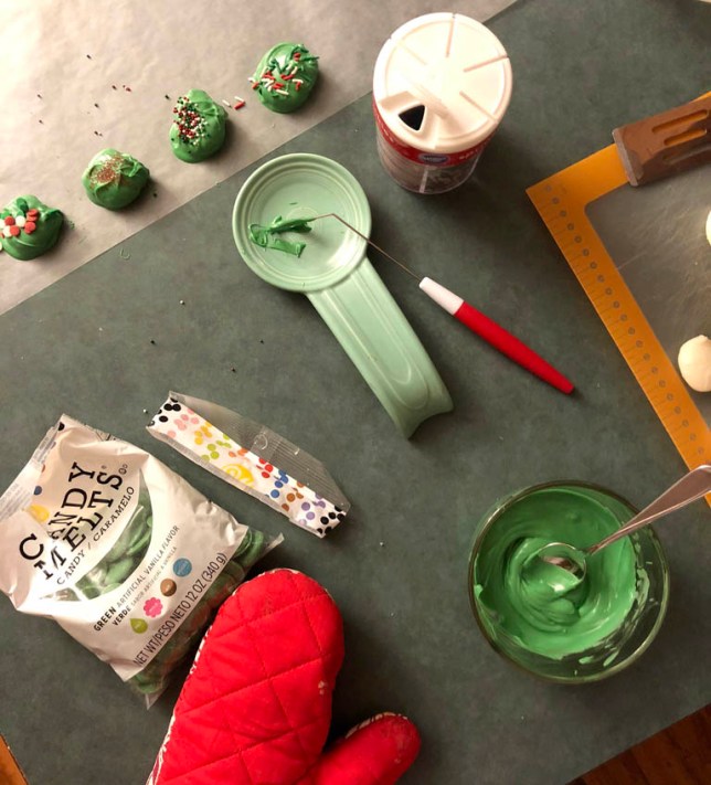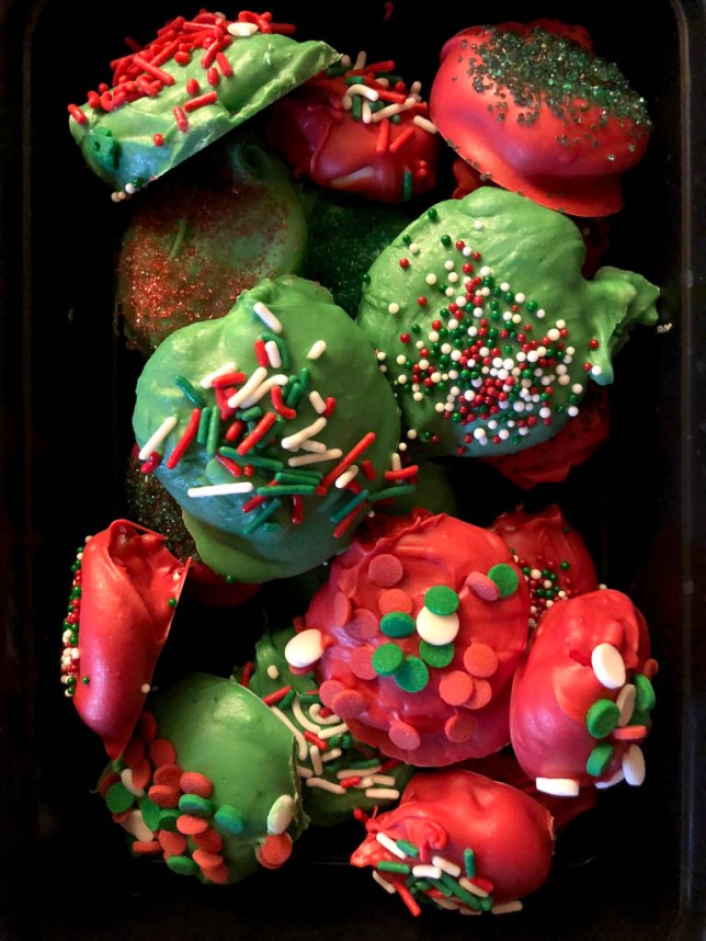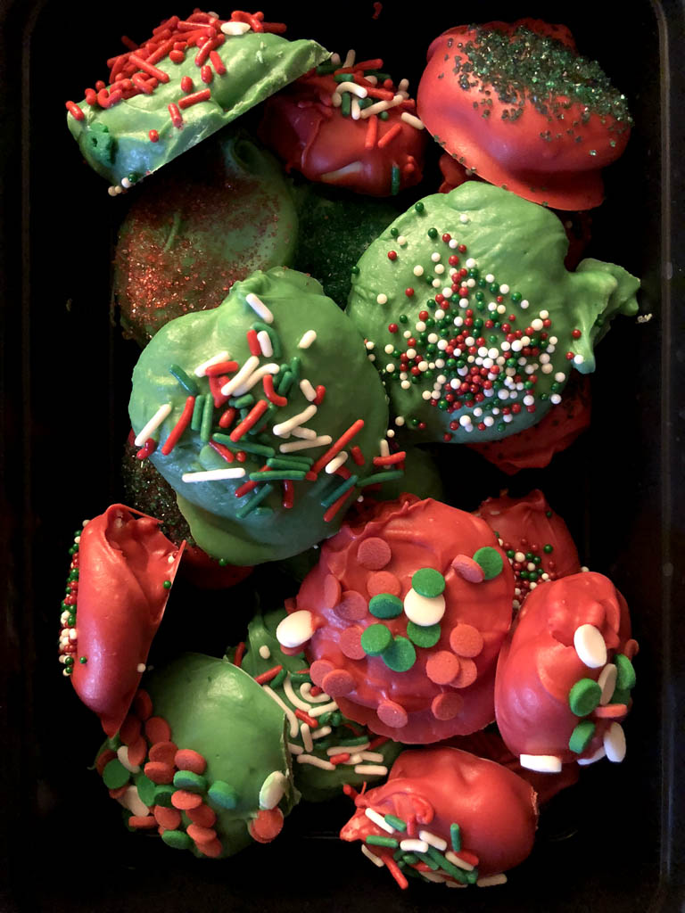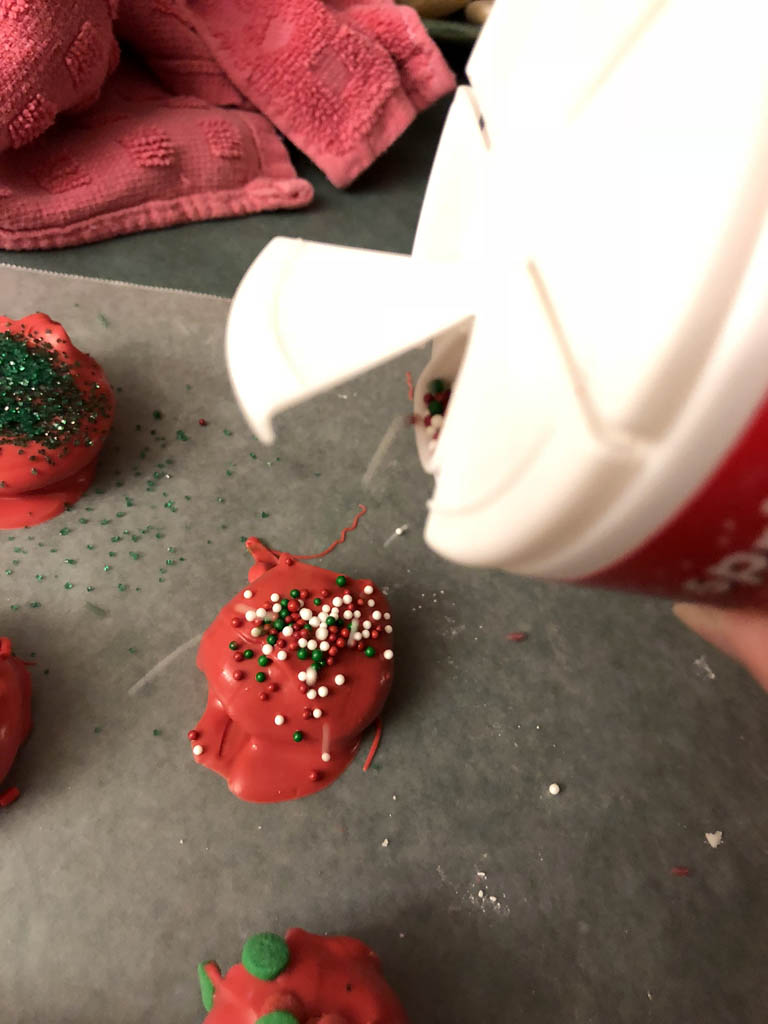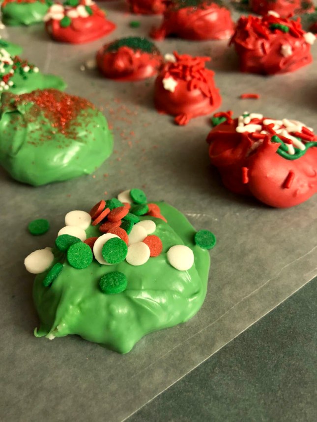 – Follow the melting directions on the back of the melting chocolate package. Once chocolate is melted, place one cream patty into the chocolate. Using a spoon, cover the patty with chocolate. Then with a fork or candy scooping tool, remove the patty out of the chocolate and place back on parchment or wax paper. Use sprinkles for garnish if you’d like. Allow to set complete before placing into containers for storage.
