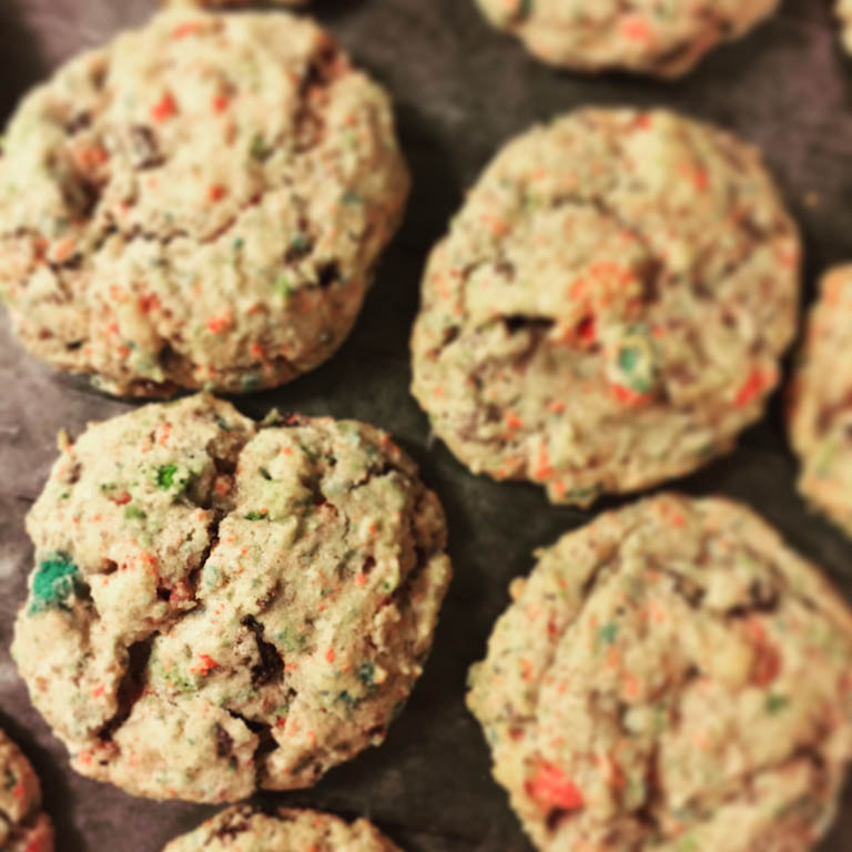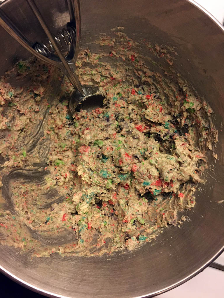I never used bananas as an egg substitute; it was always applesauce. And since I had no applesauce either, I grabbed a banana, smashed it in a small bowl, guess-timating that it made two 1/4-cups for each egg. I folded the smashed banana into the mix and then added the dry ingredients. The consistency was about the same for this sugar cookie dough. As for the taste, it’s sugar cookie dough with a hint of banana! Another bonus to this recipe is that you can safely eat the cookie dough, because…yep, no eggs!